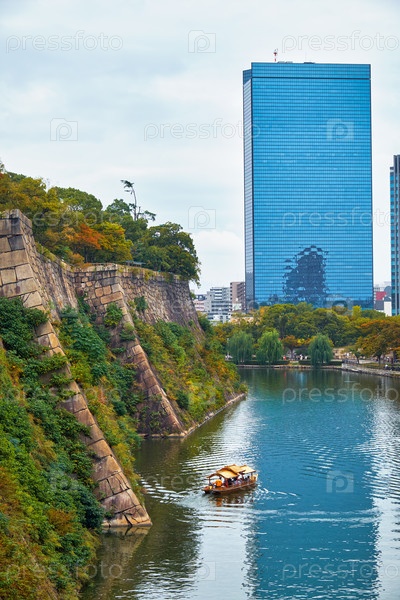 Внутренний ров Осакского замка на фоне Осакского бизнес-парка. Осака. Япония