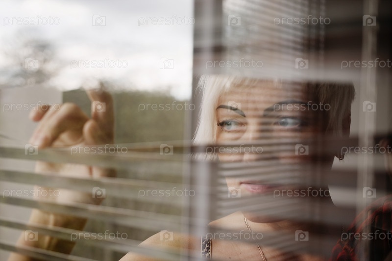 Грустная женщина за жалюзи