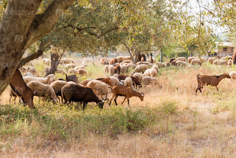 Стадо овец и коз, пасущихся среди оливковых деревьев на побережье Греции