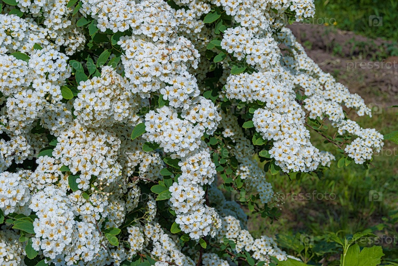 Цветы Spiraea vanhouttei цветут в солнечный день