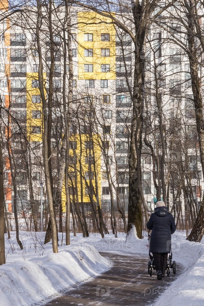 Женщина гуляет в зимнем парке с коляской. Вид сзади. Москва, Россия