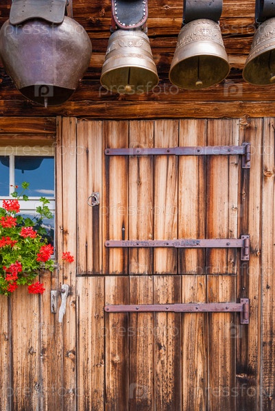 Старые коровьи колокольчики под крышей альпийской горной хижины, Швейцария
