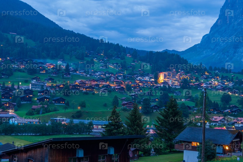 Деревня Гриндельвальд под вершиной Веттерхорна после захода солнца, Бернер-Оберланд, Швейцарские Альпы, Швейцария