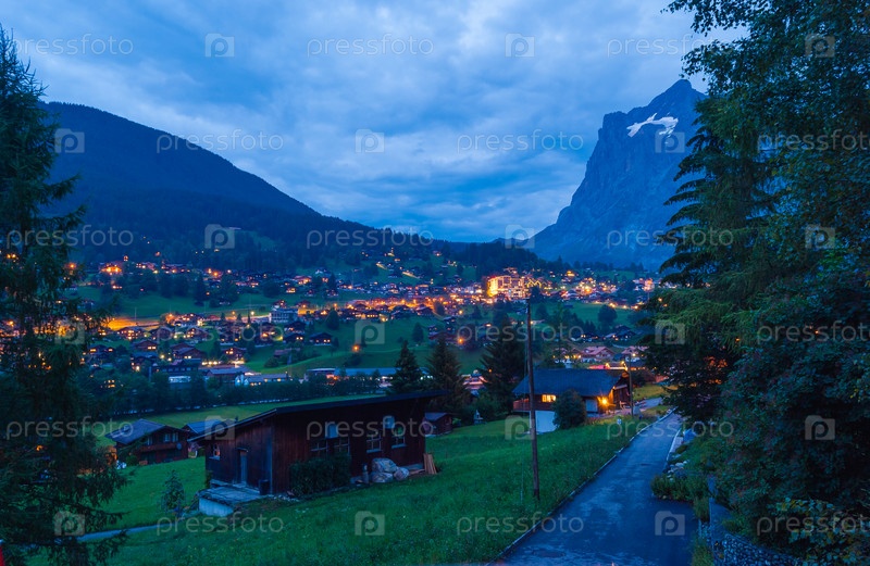 Деревня Гриндельвальд под вершиной Веттерхорна после захода солнца, Бернер-Оберланд, Швейцарские Альпы, Швейцария