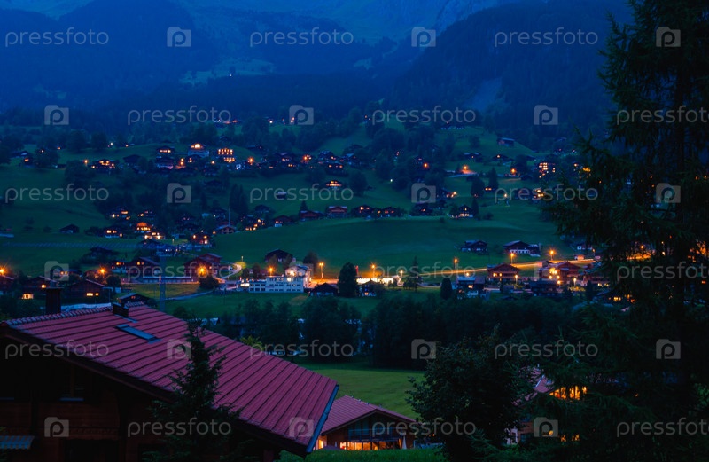 Деревня Гриндельвальд под вершиной Веттерхорна после захода солнца, Бернер-Оберланд, Швейцарские Альпы, Швейцария
