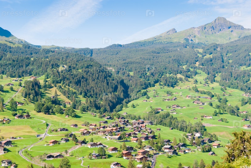 Пейзаж с горной деревней летом, Гриндельвальд, Швейцария