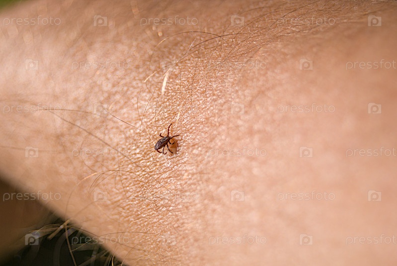 Клещ Ixodes ricinus ползет по коже человека. энцефалитический клеща. этот вид животных является носителем боррелия