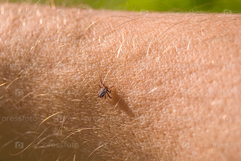 Клещ Ixodes ricinus ползет по коже человека. энцефалитический клеща. этот вид животных является носителем боррелия