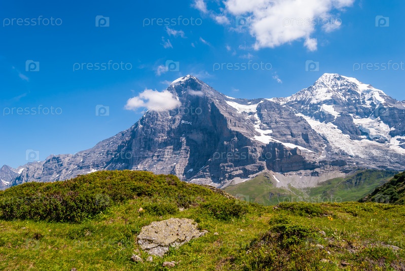 Походная тропа на фоне потрясающей альпийской панорамы северной стены пика Эйгер, Гриндельвальд, Бернские Альпы, Швейцария, Европа