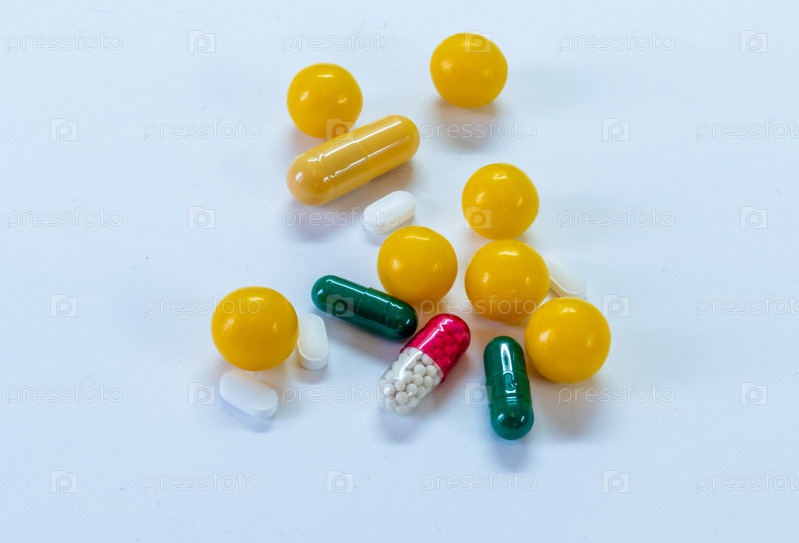 Таблетки и капсулы на белом фоне, красочный ассортимент таблеток фармацевтической медицины