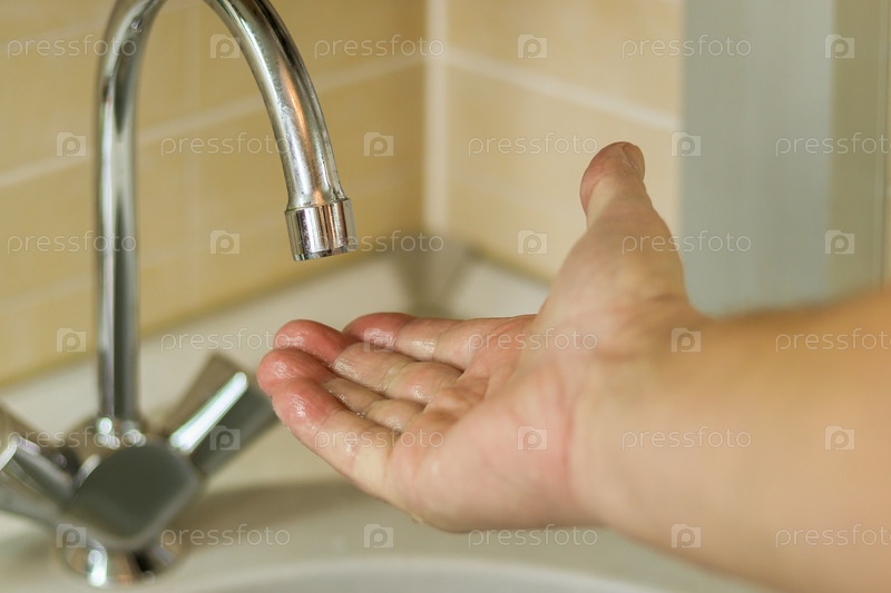 Мужская рука пробует струю воды из водопроводного крана