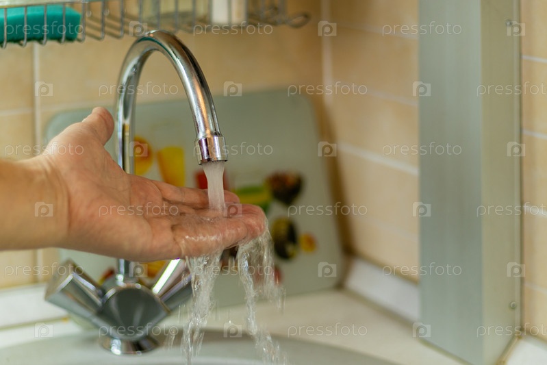 Мужская рука пробует струю воды из водопроводного крана