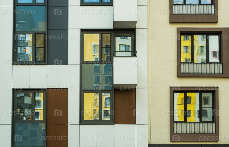 Часть современного здания с отражением других зданий в стеклянных окнах