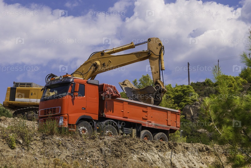 Экскаватор загружает почву самосвала на строительной площадке