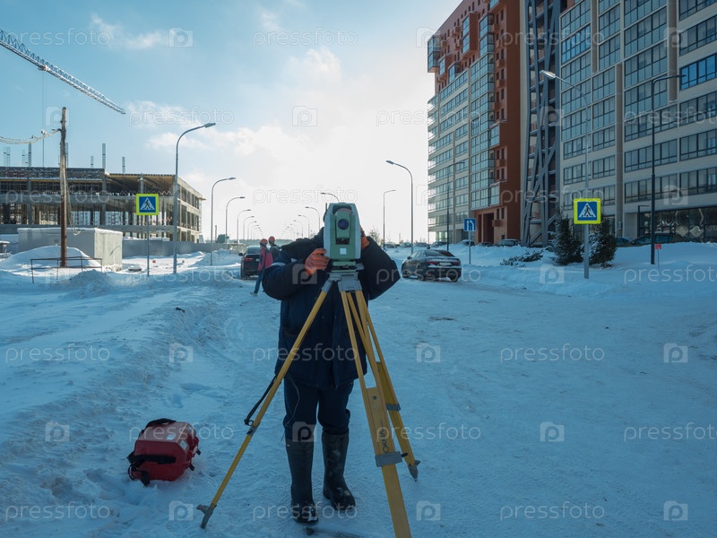 Мужчина работает с теодолитом на строительстве дома