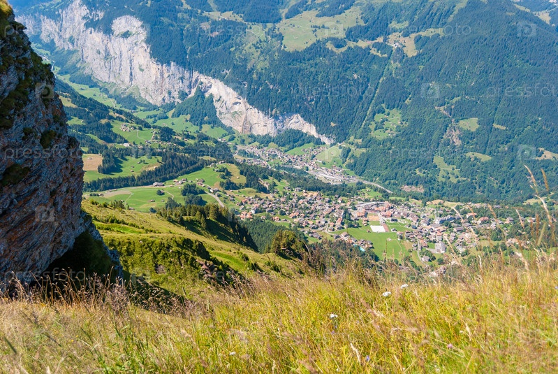 Вид на долину в горах с вершины региона Маннлихен Юнгфрау, Берн, Швейцария