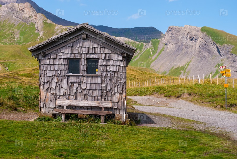 Небольшой хозяйственный дом, расположенный в Швейцарских Альпах, в окружении красивого горного ландшафта