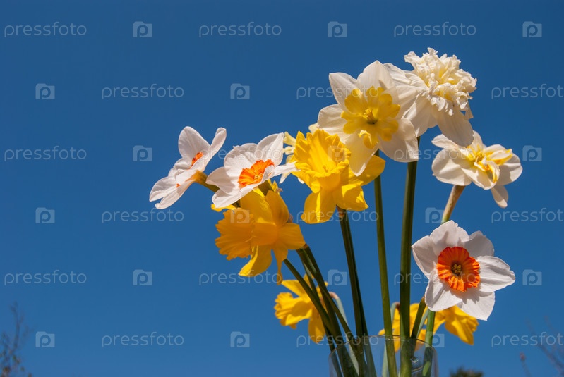 Букет разных цветов Нарцисса в солнечный весенний день на фоне голубого неба