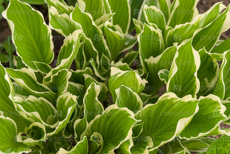 Листья хосты зеленые с белыми краями весной