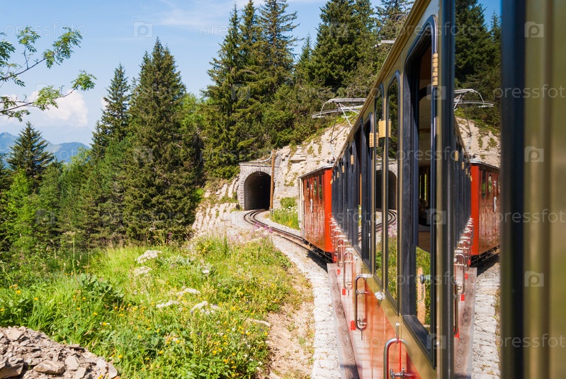 Пассажирский ретро-поезд движется из Шиниге Платте в Интерлакен. Швейцария