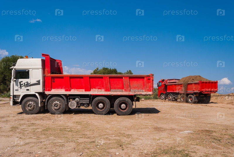 Загруженные современные самосвалы, перевозящие строительный грунт со строительной площадки