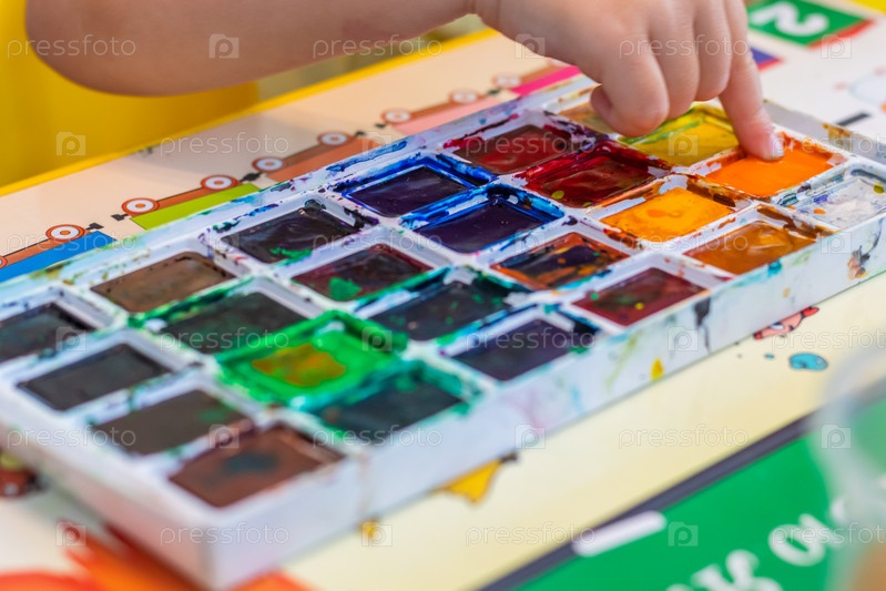 Детская рука погружает палец в краску на палитре, чтобы нарисовать