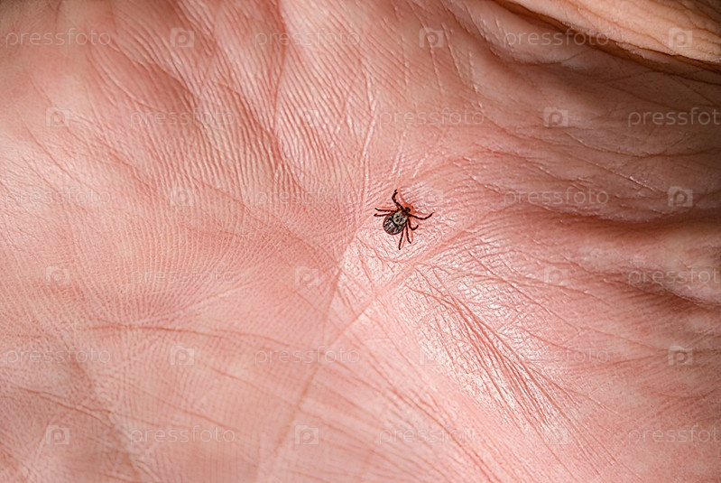Клещ Ixodes ricinus ползет по коже человека. энцефалитический клеща. этот вид животных является носителем боррелия