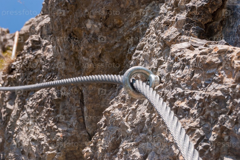 Стальной трос, прикрепленный к скале для безопасности пешеходного маршрута в горах Швейцарии