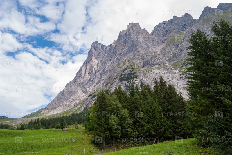Красивый альпийский пейзаж с пиком Веттерхорна, Гриндельвальд Бернский Оберланд Швейцария Европа