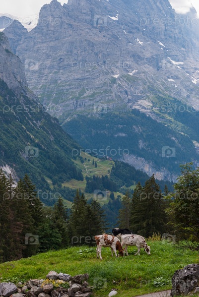 Коровы пасутся на альпийских холмах. Гриндельвальд, Швейцария