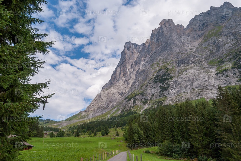 Красивый альпийский пейзаж с пиком Веттерхорна, Гриндельвальд Бернский Оберланд Швейцария Европа