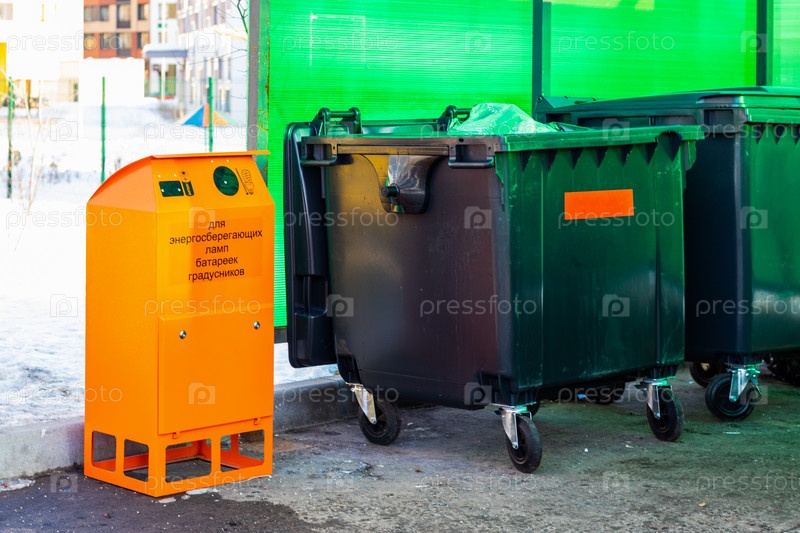 Платформа для сбора мусора, пластиковый контейнер для мусора, отдельный бокс для сбора опасных отходов. Надпись на баке: «для энергосберегающих ламп, аккумуляторов, термометров»