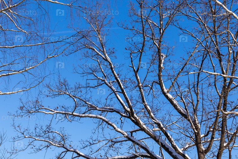 Красивый зимний пейзаж с заснеженными ветвями дерева на фоне голубого неба в солнечный день зимой