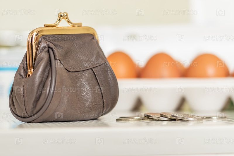 Бумажник, калькулятор, продукты. концепция расчета ежедневных расходов