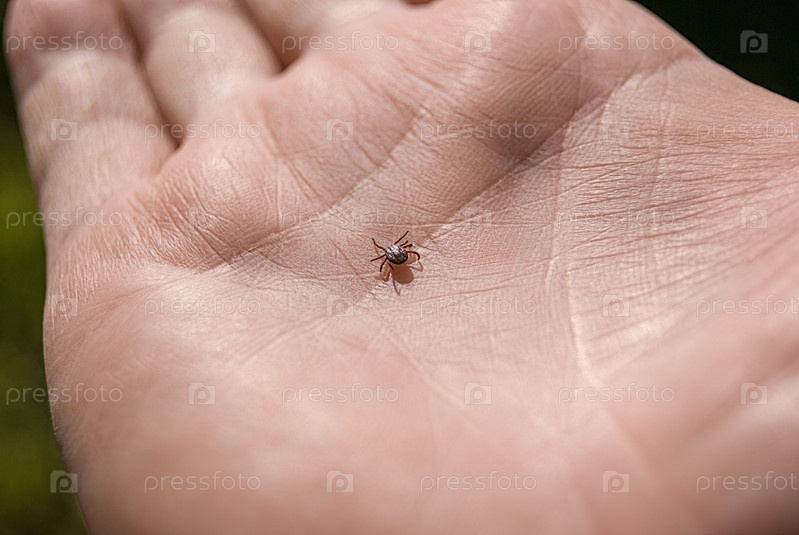 Клещ Ixodes ricinus ползет по коже человека. энцефалитический клеща. этот вид животных является носителем боррелия