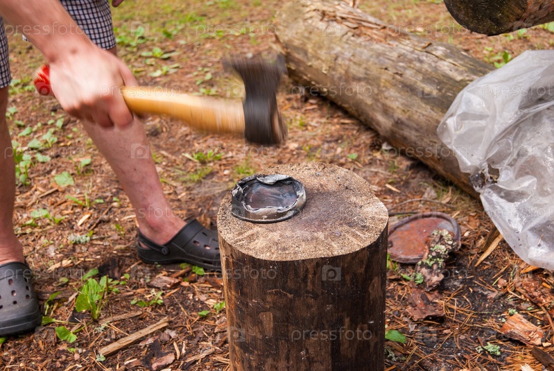 Процесс утилизации металлических банок в туристическом походе