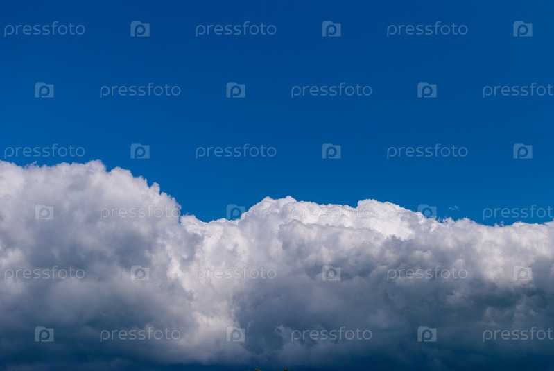 Белые сплошные кучево-дождевые облака на фоне сочного голубого неба