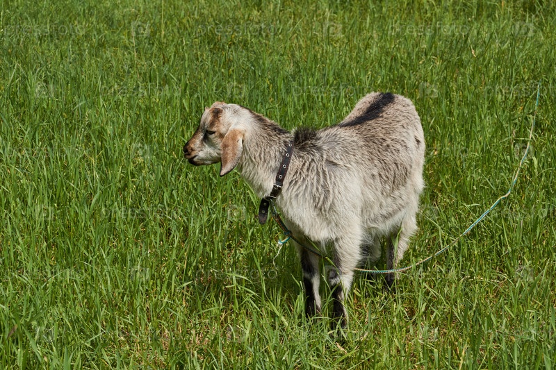Лето. Коза пасется на лугу в теплый летний день