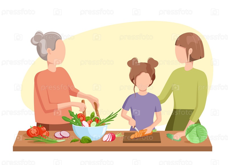 Семья готовит. Бабушка, мама и дочь на кухне. Мультяшный дизайн