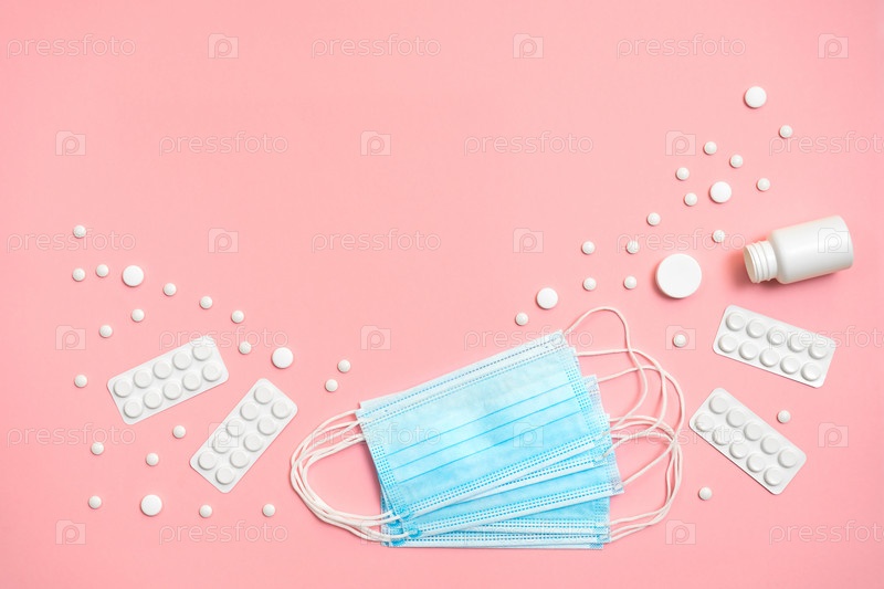 Синие маски, белые таблетки оптом и в блистерах на розовом фоне. Медицинский фон для дизайна
