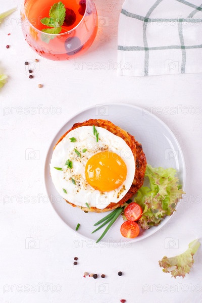 Яичница на стопке оладий из цуккини и ягодный лимонад в стакане на белом столе. Вид сверху