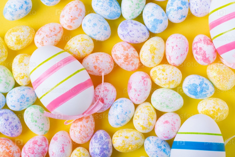 Пасхальный фон с разноцветными декоративными яйцами на желтом. Праздничная плоская планировка. Полный кадр