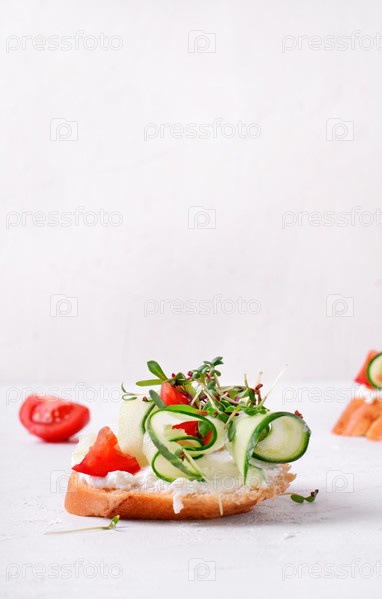 Вегетарианская брускетта со сливочным сыром, огурцом, перцем, помидором и микрозеленью на белом столе