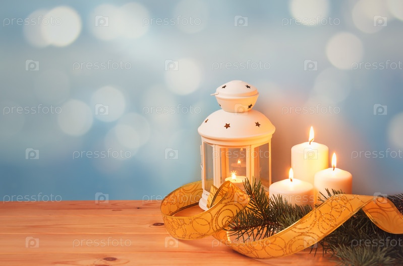 Белый фонарь, свечи, декоративная лента и еловые ветки. Выборочный фокус. Просмотр с копией пространства