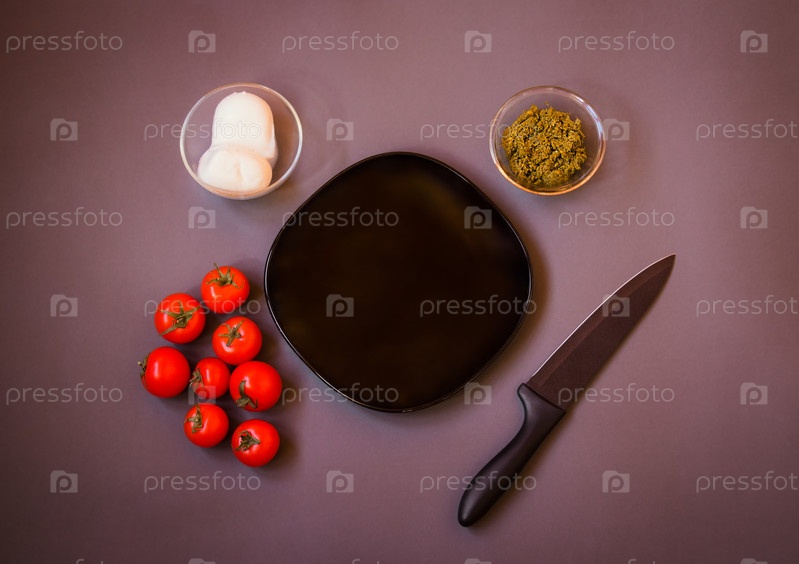 Помидоры, соус песто и сыр моцарелла для приготовления салата капрезе вокруг пустой тарелки на сером фоне