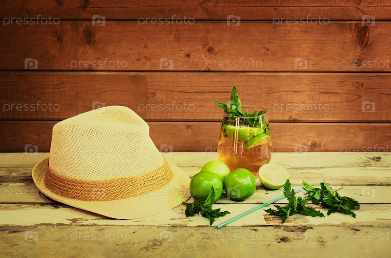 Шляпа и стакан коктейля мохито с лаймом и мятой на деревянном фоне. Тонированное изображение. Выборочный фокус