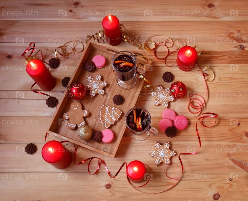 Два стакана глинтвейна, рождественские пряники, свечи, шарики, клубничное миндальное печенье и шоколадное печенье