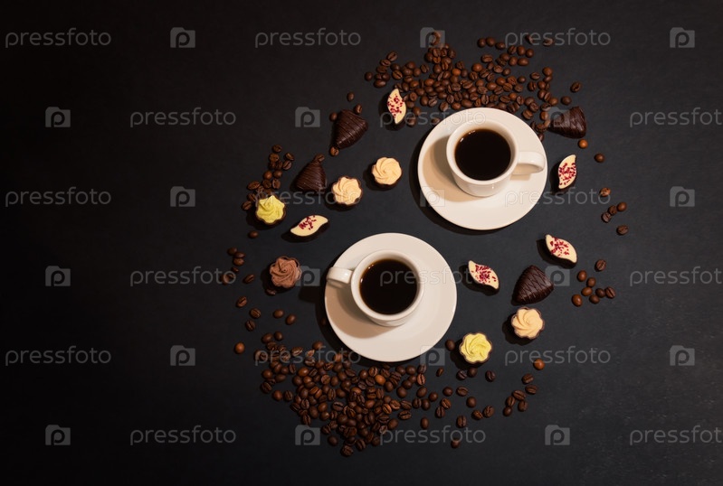 Чашки кофе, кофейные зерна и шоколадные конфеты на темном фоне