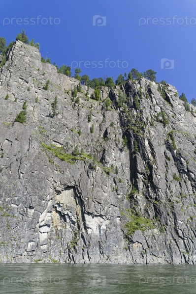 Высокий отвесный скальный берег реки Ока Саянская. Иркутская область, Сибирь, Россия. Солнечный день в августе