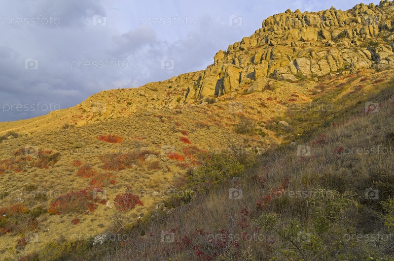 Скалы, красиво освещенные вечерним солнцем. Мыс Меганом, Крым, середина октября